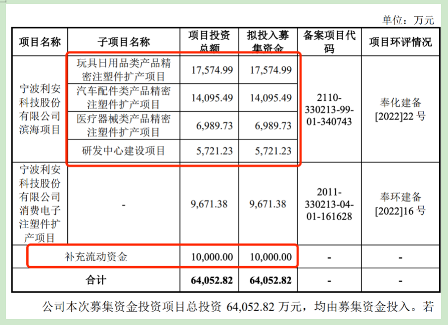 根据披露,利安科技此次IPO公司拟在创业板公开发行1406万股,预计募集资金6.41亿元用于宁波利安科技股份有限公司滨海项目、宁波利安科技股份有限公司消费电子注塑件扩 产项目和补充流动资金。其中,滨海项目分为四个子项目,包含研发中心在内累计总投资达到4.44亿元,此外,补充流动资金项目拟募集资金达到1亿元。