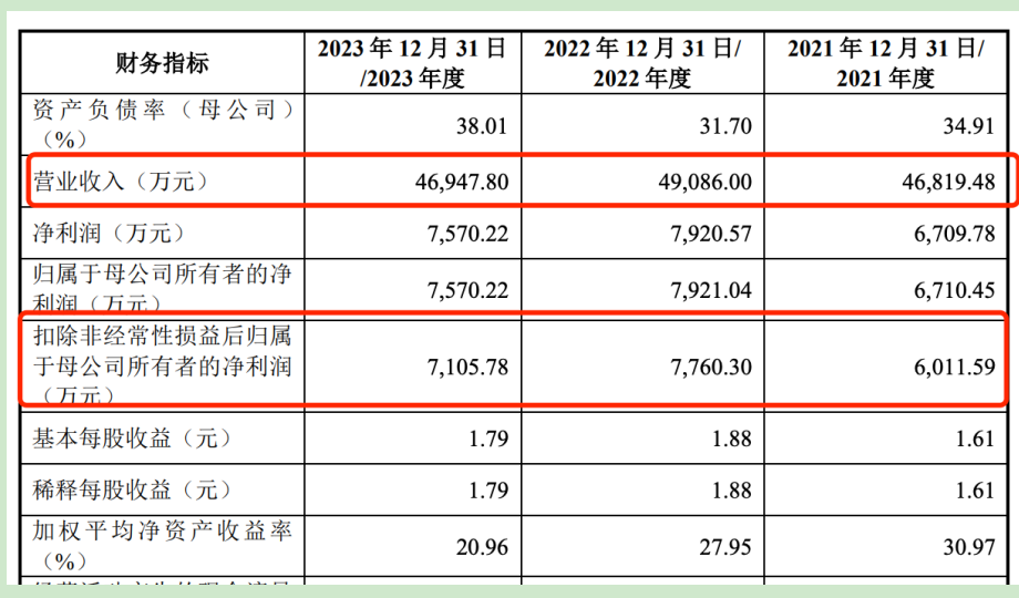 招股书显示,利安科技在2021 年度、2022 年度和 2023 年度,公司主营业务收入分别为 46,407.86 万元、48,813.15 万元和 46,947.80 万元;实现扣除非经常性损益后归属于母公司所有者的净利润分别为6,011.59万元、7,760.30万元和7,105.78万元。