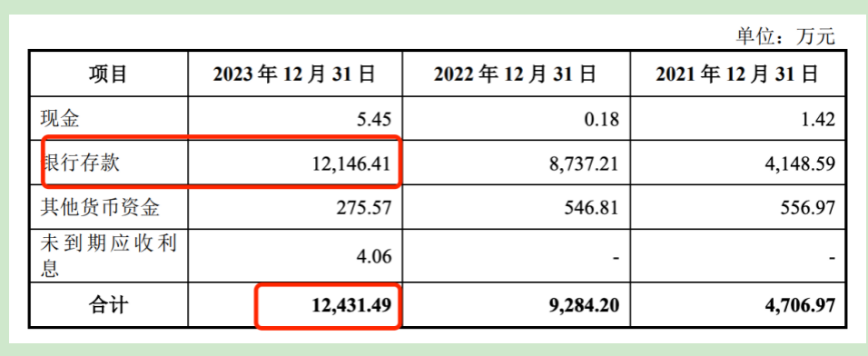 根据招股书披露,利安科技在2021年至2023年度货币资金分别为4,706.97万元、9,284.20万元、12,431.49万元,其中上述期间内的银行存款占比绝大部分货币资金。截止到2023年末,利安科技银行存款金额为1.21亿元。