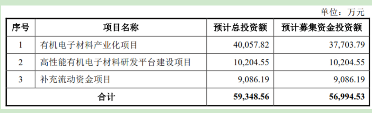 据招股书,海谱润斯主要从事于OLED蒸镀材料技术研发、生产、销售和提纯服务。公司的产品和服务按照材料的性质划分,主要为有机材料业务和无机材料业务。此次IPO,公司拟募集56,994.53万元,分别用于“有机电子材料产业化项目”;“高性能有机电子材料研发平台建设项目”以及补充流动资金。