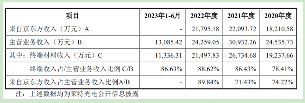 海谱润斯来自京东方收入占蒸镀材料业务收入的比例为91.49%、87.84%和88.21%,2020年度至2022年度,莱特光电来自京东方收入占其主营业务收入的比例为74.22%、71.43%和89.84%,而莱特光电的主营业务收入中,除终端收入外,另有中间体材料等业务,其中,终端收入占主营业务收入比例依次为78.41%、86.43%和88.62%。而京东方向莱特光电采购的主要为终端材料,即莱特光电向京东方销售的终端材料收入占终端材料收入比例较高。