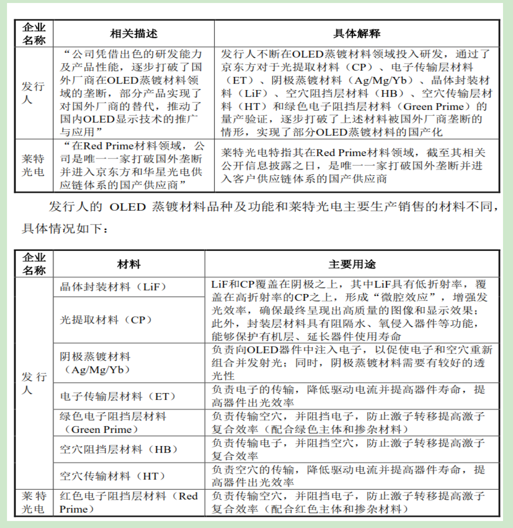 结合上图披露内容,海谱润斯认为公司在OLED蒸镀材料领域中实现了9支材料国产化,旨在强调海谱润斯逐步打破国外厂商在OLED蒸镀材料领域的垄断以及部分产品实现了对国外厂商的替代;而莱特光电在其招股书中特指其在RedPrime一支材料打破了国外垄断。二者描述均存在特定的前提和范畴,不存在矛盾。