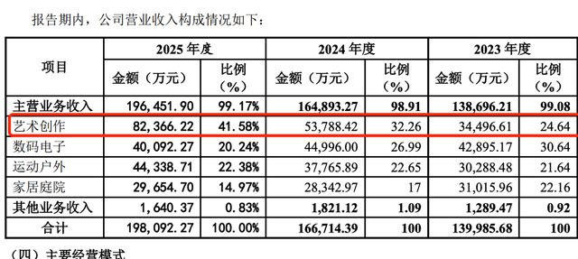 报告期内,千岸科技营收结构出现大幅异动,波动幅度远超行业正常水平,进一步加剧了业绩真实性质疑。2022-2024年,公司家居庭院类产品收入占比从30.88%骤降至17.00%,降幅超45%;而艺术创作类产品收入占比从19.02%飙升至32.26%,增幅超69%,两大核心品类占比一降一升,波动幅度远超同行。