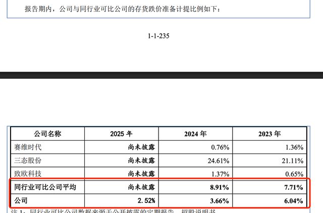 进一步分析公司存货数据,2023-2025年,公司存货余额分别为1.79亿元、2.38亿元和2.46亿元,占资产总额的比例常年维持在26%以上,存货规模持续高企,大量占用公司流动资金。更值得关注的是,公司存货跌价准备计提比例显著低于同行业平均水平,2024年公司存货跌价准备计提比例仅为3.66%,而行业均值高达8.91%,计提比例不足行业均值的一半。