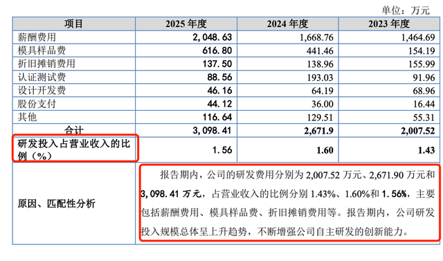 公司回应称,毛利率提升得益于产品创新、品牌溢价、供应链优化以及产品结构调整,但这一解释并未消除市场疑虑。一方面,公司研发投入长期偏低,2023-2025年研发投入占营收比例仅为1.43%、1.60%、1.56%,远低于行业平均水平,研发团队规模仅62人,且本科以下学历占比极高,自主研发能力薄弱,所谓的“产品创新”缺乏支撑,难以形成核心技术壁垒。