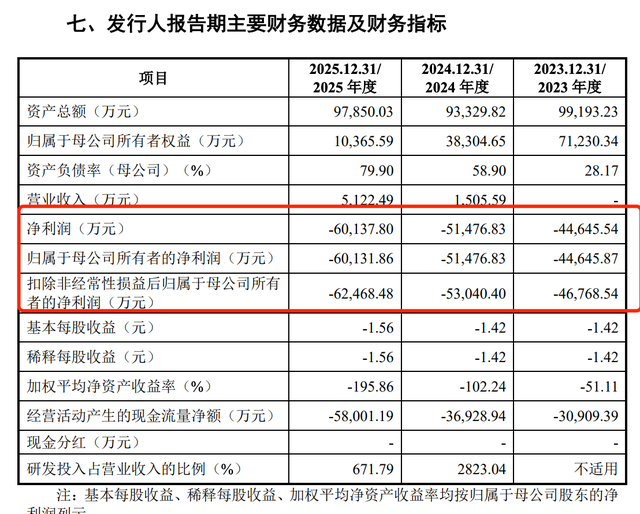 泰诺麦博的财务数据,是市场质疑的核心起点。招股书与问询回复显示,2022-2025年,公司归母净利润分别为-4.29亿元、-4.46亿元、-5.15亿元、-6.01亿元,四年累计亏损高达近20亿元,未弥补亏损超10亿元。亏损规模逐年扩大,2025年单年亏损超6亿元,相当于日均烧掉164万元。