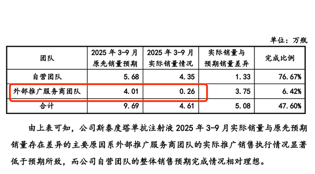 为推动销售,公司组建350人销售团队,2025年砸下1.9亿元推广费但效果甚微。外部推广服务商预期销量4.01万支,实际仅完成0.26万支,完成率低至6.42%,巨额推广费几乎打了水漂。更尴尬的是,产品虽于2025年12月纳入医保,但医保谈判后价格大幅下调,公司需与经销商协商差价补偿,进一步压缩利润空间,甚至可能冲减已确认收入。