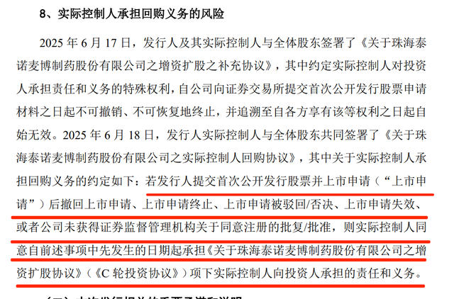 泰诺麦博急于上市的核心原因,是实控人背负的“对赌炸弹”。2025年6月,廖化新与全体股东签署回购协议,若IPO申请撤回、终止或被否决,实控人必须履行回购义务,回购金额高达数十亿元。