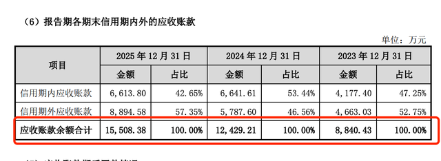 报告期内,新睿电子应收账款规模连年大幅增长,成为拖累公司财务健康的最大隐患。2023-2025年末,公司应收账款余额分别为8840.43万元、12429.21万元和15508.38万元,呈现“应收账款激增”的异常态势。