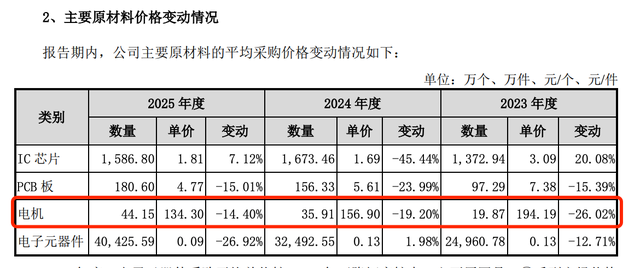 北交所第二轮问询函重点追问了新睿电子原材料采购价格的公允性,直指供应商背后的利益输送嫌疑。公司主要原材料为电机、电子元器件、IC芯片、PCB板等,其中电机采购占比约30%,主要向格特电机、众川电机两家供应商采购,2023-2025年上半年,电机采购均价同比分别下滑26.02%、19.2%、12.2%;IC芯片采购均价2024年同比下滑45.44%,降幅远超市场同期价格波动水平。