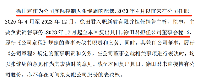 资料显示,徐田君为本科学历,此前仅有行政、律所内勤等相关工作经历,无资本市场、财务、法律相关专业背景,也未具备董秘所需的任职资格与从业经验,2023年底直接被提拔为公司董事、董秘,属于典型的“任人唯亲”。