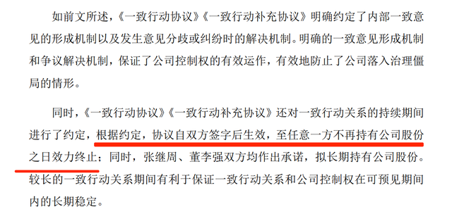 除了亲属任职,新睿电子控制权稳定性也存在重大缺陷,实控人张继周与董李强签署的《一致行动协议》暗藏致命漏洞。协议明确约定,“至任意一方不再持有公司股份之日起效力终止”,这意味着一旦董李强减持股份或退出公司,一致行动关系自动失效,张继周的控制权将直接受到冲击。