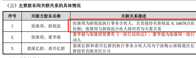 从股权结构来看,公司股权高度集中,实控人张继周拥有绝对控制权。张继周直接持有公司34.52%股份,通过员工持股平台临海新锐泓间接控制3.80%表决权,同时与第二大股东董李强签署《一致行动协议》,掌控其16.19%股份的表决权,合计控制公司54.51% 的表决权,形成“一股独大”的控股格局。董李强作为公司创始股东之一,与张继周长期合作,成为其一致行动人;而张继周配偶徐田君,不仅间接持有公司股份,还担任公司董事、董事会秘书,家族化管理特征极为突出。