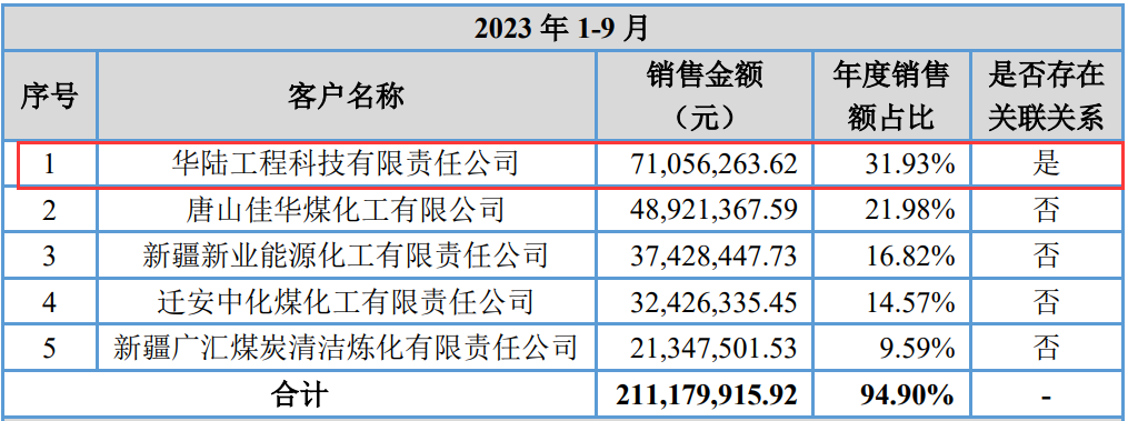 值得注意的是,2023年前三季度,公司第一大客户华陆工程科技有限责任公司(以下简称华陆公司)与其存在关联关系。华陆公司直接持有今大禹13.51%的股份。华陆公司为今大禹新开拓客户,2023年开始确认收入。2023年前三季度,今大禹来自华陆公司应收账款为4,480.00万元,占公司应收账款期末余额比例25.87%,占当期两者收入比例63.05%。公司开拓华陆公司不足一年,华陆公司就位列第一大客户位置,而且超过六成为应收账款。若算上公司与华陆公司1,520.00万元的合同资产,公司对其应收款项高达6,000.00,占当年两者业务额的84.44%。今大禹与华陆公司之间的业务真实性有待确认。