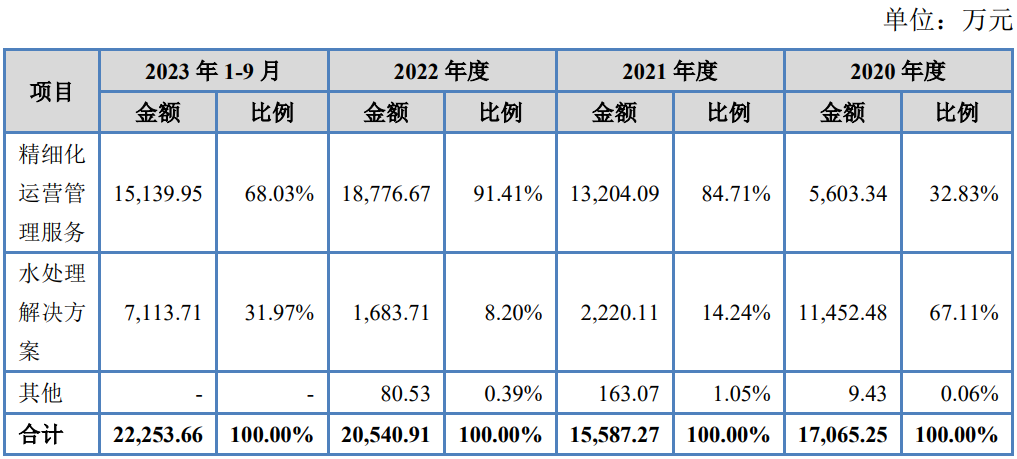 招股书显示,今大禹主营业务是依托从工业废水预处理到零排放全流程的自有核心技术、丰富的运营管理经验,为客户提供水处理解决方案和精细化运营管理服务,致力于成为工业废水处理领域全周期的创新型综合服务商。从收入结构来看,公司精细化运营管理服务贡献收入占比显著提高,2020-2023年前三季度(下称报告期),其营收占比分别为32.83%、84.71%、91.41%和68.03%。