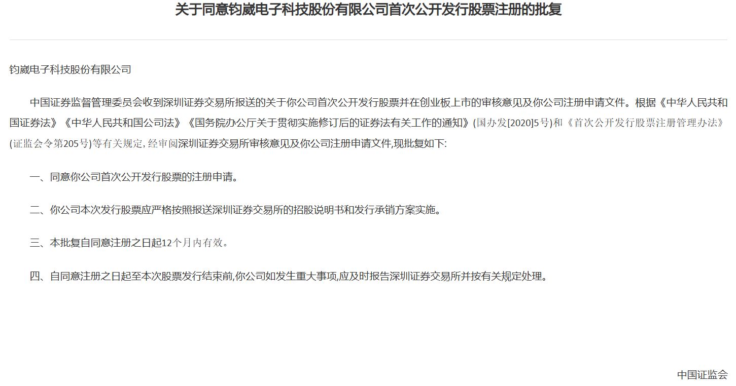 小财米注意到,2024年10月31日,证监会网站披露,同意创业板企业钧崴电子科技股份有限公司的首次公开发行股票注册的批复。