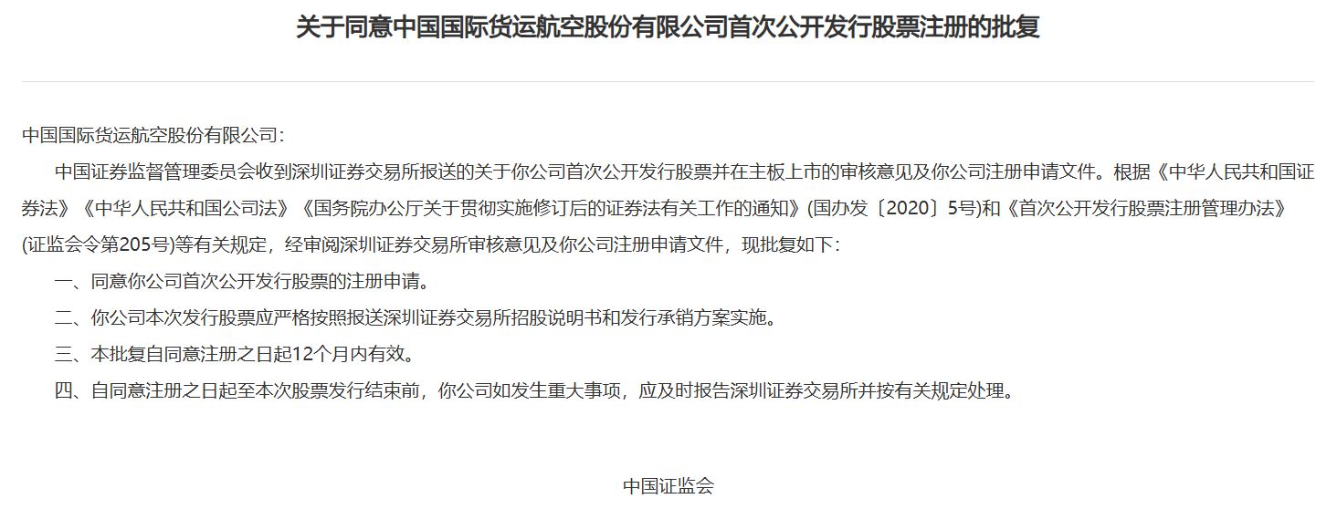 2024年11月1日,证监会网站披露,同意深交所主板企业中国国际货运航空股份有限公司的首次公开发行股票注册的批复。