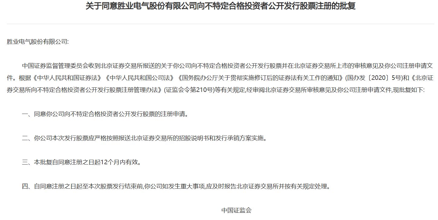 2024年11月1日晚,证监会网站披露,同意北交所企业胜业电气股份有限公司向不特定合格投资者公开发行股票注册的批复。