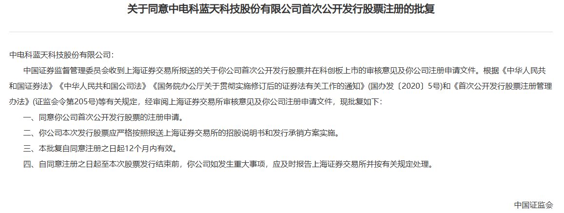 小财米注意到,2025年12月31日,证监会网站披露,同意科创板企业中电科蓝天科技股份有限公司的首次公开发行股票注册的批复。