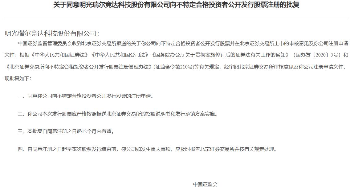 小财米注意到,2026年03月06日,证监会网站披露,同意北交所企业明光瑞尔竞达科技股份有限公司向不特定合格投资者公开发行股票注册的批复。