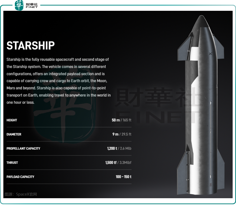 根据SpaceX网站介绍,新一代重型运载火箭“星舰”是迄今全球体积最大、推力最强的运载火箭,总高度约120米,直径约9米,能够承载多达150公吨的完全可重复使用的物料和250公吨的物料消耗品。