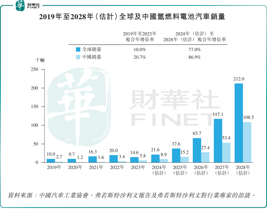 在政策的扶持下,我国氢能市场有望蓬勃发展。氢燃料电池汽车是氢能应用领域未来最为广阔的市场之一,中汽协等数据显示,预计2024年至2028年我国氢燃料电池汽车销量由8900辆增长至10.85万辆,复合年增长率高达86.9%。
