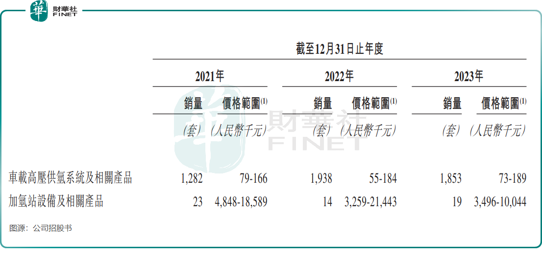 公司车载高压供氢系统及相关产品在2023年销量不增反降,由上年的1938套下降至1853套,但国富氢能通过涨价抵消了其不利影响,2023年该产品价格范围取得明显上升,为7.3万元-18.9万元。