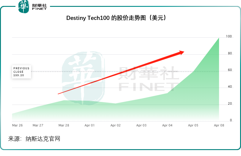 这几天,华尔街刷屏的是一家封闭式基金公司Destiny Tech100(DXYZ.US)。从2024年3月26日上市当日开盘的8.25美元,飙涨至2024年4月8日的99.79美元,不到十个交易日,涨幅就达到11倍,见下图,而在2024年4月9日的盘前交易时段,Destiny Tech100更进一步上涨17.00%。