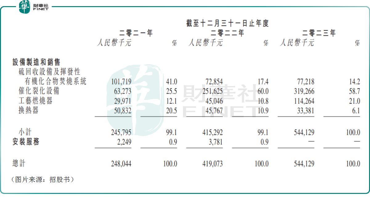 2021年时,公司的核心业务是硫回收设备及挥发性有机化合物焚烧设备。而自2022年开始,硫回收设备及挥发性有机化合物焚烧设备贡献的收入出现下降,2023年在营收中的占比降至14.2%;反而是催化裂化设备的收入连续增长,成为了业绩的主要贡献者,2023年的收入占比达到58.7%;工艺燃烧器的收入占比亦在增长,而换热器的收入则在连续萎缩。