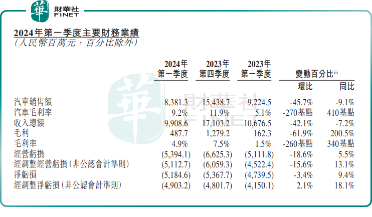 毛利率方面,一季度同比增长3.4个百分点,环比降低2.6个百分点至4.9%。作为对比,理想汽车第一季度毛利率为20.6%,小鹏汽车第一季度毛利率为12.9%。