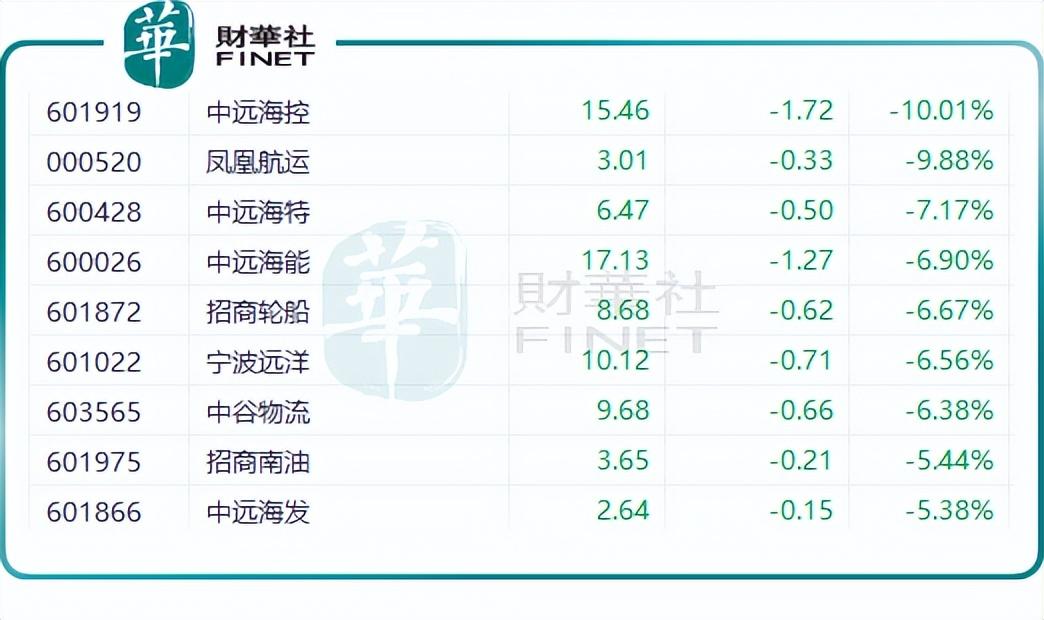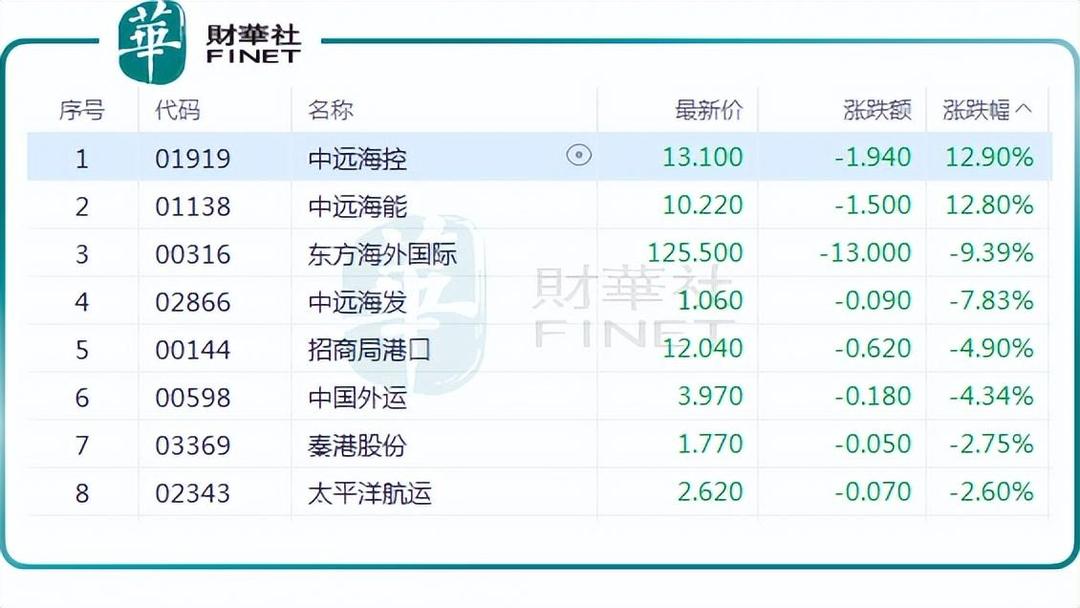港股方面,中远海控(01919.HK)大跌12.9%,中远海能(01138.HK)跌12.8%,东方海外国际(00316.HK)跌9.39%,中远海发(02866.HK)跌7.83%。