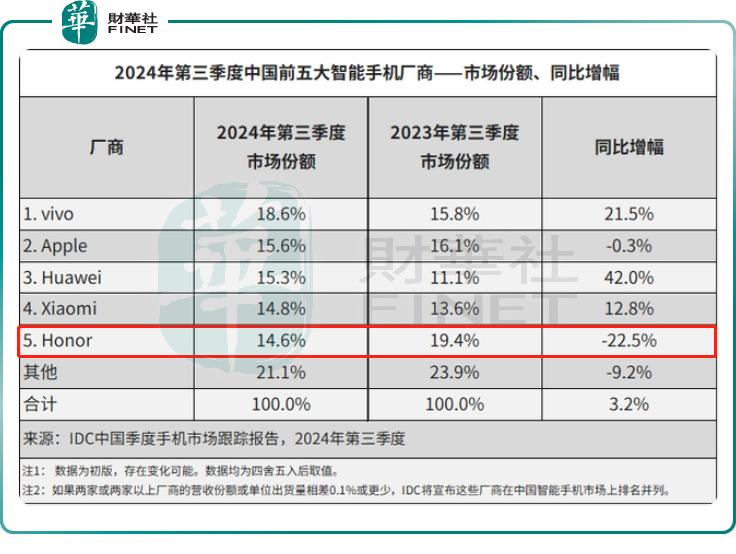 IDC数据显示,于今年第三季度,荣耀在中国智能手机市场的占有率为14.6%,虽然保持前五的位置,但相较于上年同期19.4%的市占率下降了4.8个百分点,为前五大手机厂商中市占率下滑最严重的厂商。