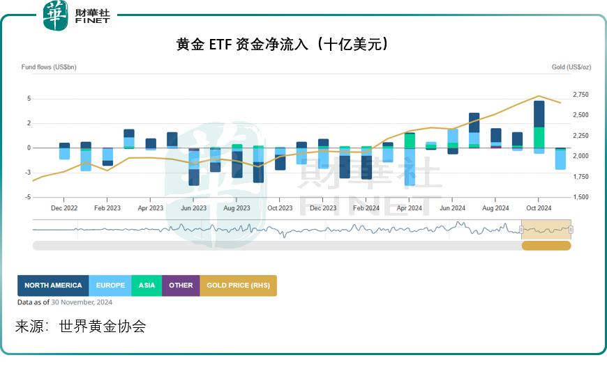 同时黄金ETF资金净流入于今年5月至10月也在增加,但到11月却出现净流出,这是今年4月以来的首次,其中欧洲机构净流出最高,而北美是唯一录得净流入的地区,见下图。