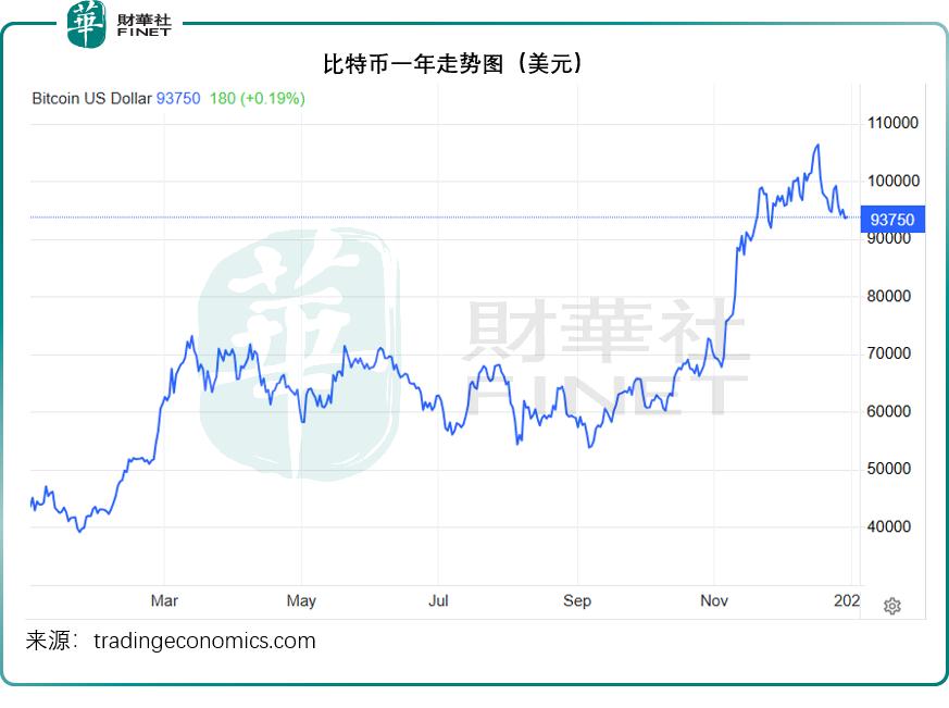 对币圈友好的特朗普当选,以及ETF获批,令比特币一飞冲天,一度突破10万美元,现在虽然回落至93,750美元,仍较期初时的42,555.95美元高出120.30%,见下图。