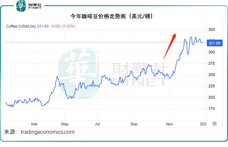 另一方面,阿拉比卡咖啡豆期货却在今年展现出不一样的行情,由于担心巴西的不利天气持续影响收成,咖啡豆价格狂飙,从年初大约每磅190.2美元,大幅涨至当前的321.69美元,涨幅高达累计涨幅大约69.1%。