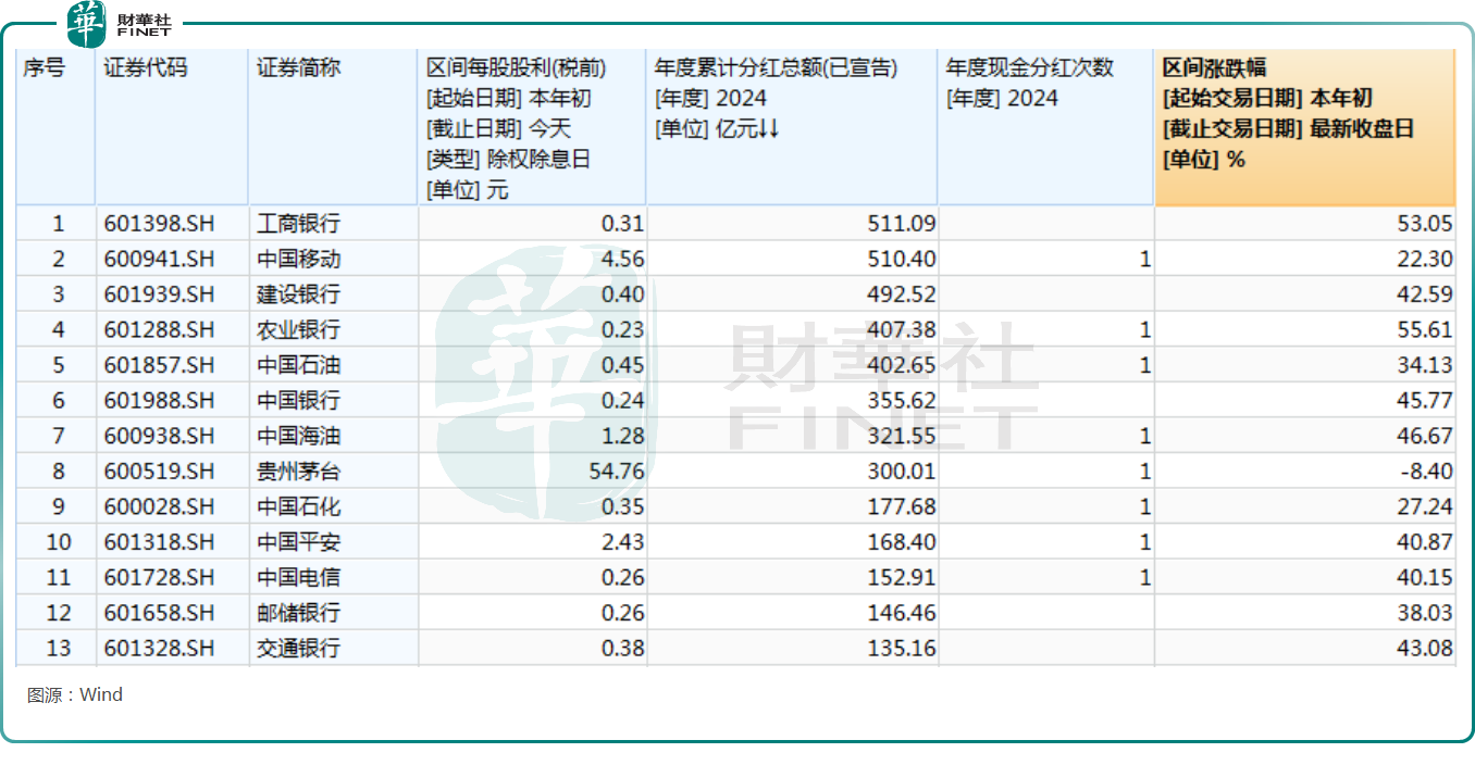 Wind数据显示,截至12月30日,从年度累计分红总额(已宣告)指标来看,13家公司累计分红金额超100亿元,均来自于沪市。其中,工商银行(601398.SH)、中国移动(600941.SH)的派现金额超过500亿元,分红最多;建设银行、农业银行、中国石油(601857.SH)、贵州茅台(600519.SH)、中国平安(601318.SH)等一些公司派现也逾百亿元。