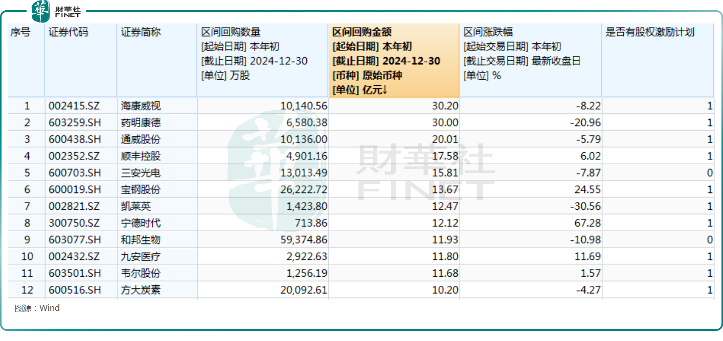 Wind数据显示,从回购金额来看,年内(截至12月30日)有12家A股公司的回购金额超过10亿元。其中,海康威视(002415.SZ)以30.20亿元的回购金额位列第一,药明康德紧随其后,回购额为30.00亿元,通威股份则以20.01亿元的回购额位居第三。此外,三安光电、宁德时代、顺丰控股、宝钢股份等公司的回购额也都超过了10亿元。