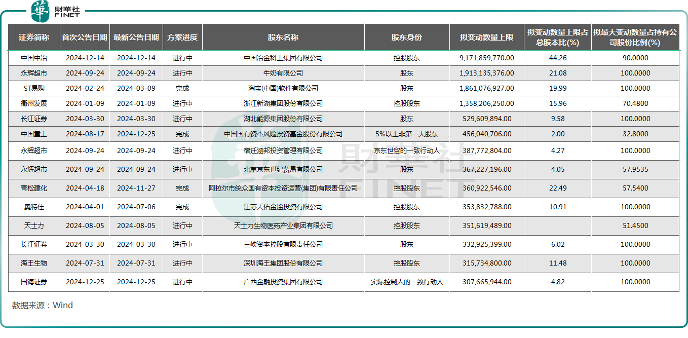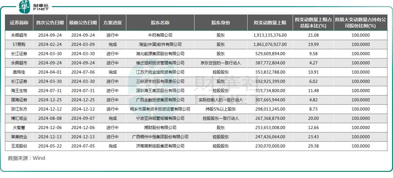在减持方面,Wind数据显示,年内(截至12月30日)有超过1640家公司的3400位股东发布了减持相关公告。从拟减持数量上限指标来看,中国中冶、永辉超市、ST易购、长江证券、中国重工位居前列。