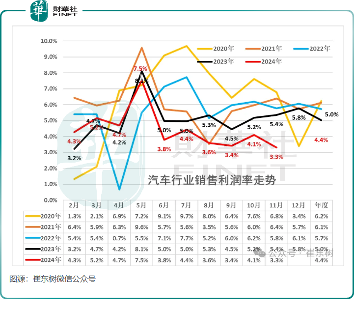 此外,催东树近日在中国汽车流通协会发布的文章显示,2024年1-11月的汽车行业收入9.46万亿元,同比增幅仅为3%;成本为8.3万亿元,同比增长4%;利润4132亿元,同比下降7.3%;汽车行业销售利润率为4.4%,均低于2020年至2023年各年度的销售利润率。