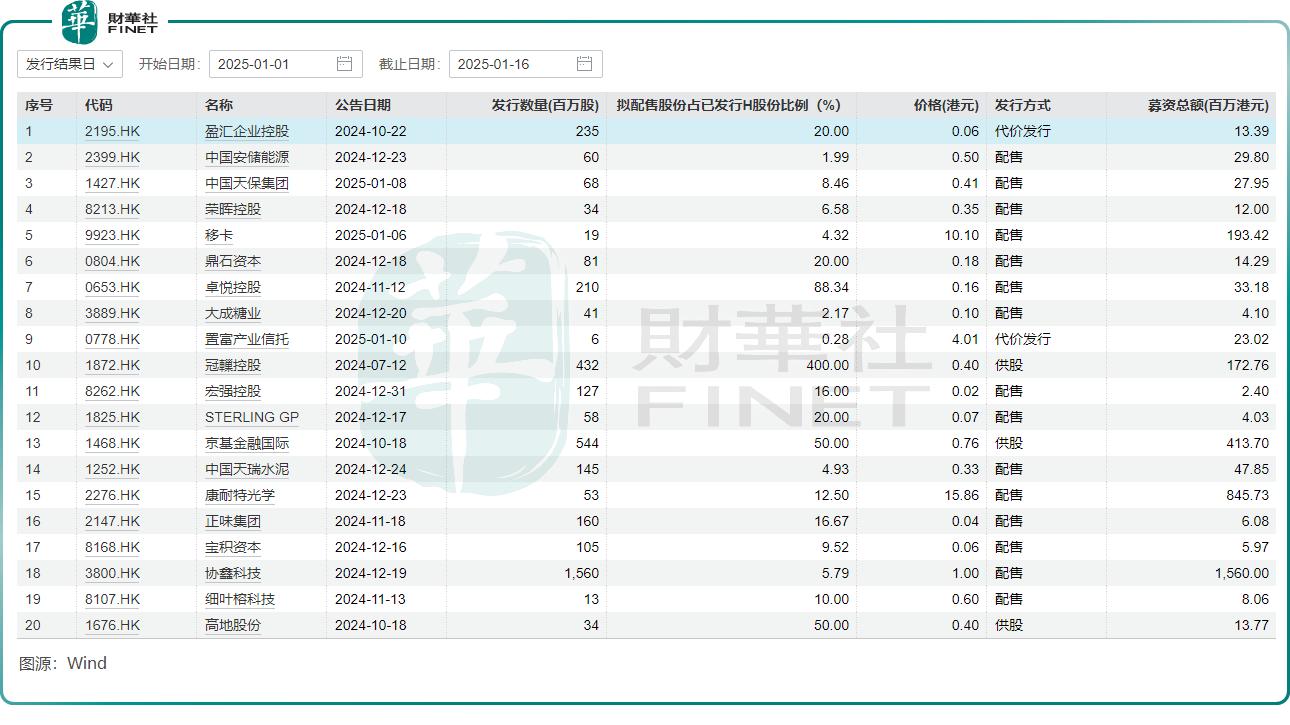 根据Wind数据,2025年1月1日至16日,包括移卡(09923.HK)、协鑫新能源(00451.HK)和中国儒意(00136.HK)等在内的21家企业披露了再融资公告。这些企业大部分选择以配售股份的方式进行筹资,少部分以发行代价股份的方式筹资。