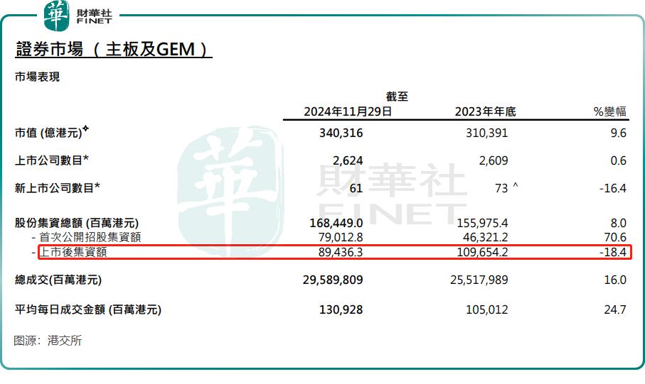 Wind数据显示,在2024年全年,港股市场再融资(不含可转债)规模达到880亿港元,刚好与当年IPO募集总金额相当。而据港交所此前披露的数据,截至2024年11月29日,港股上市公司的再融资总额达894.36亿港元。