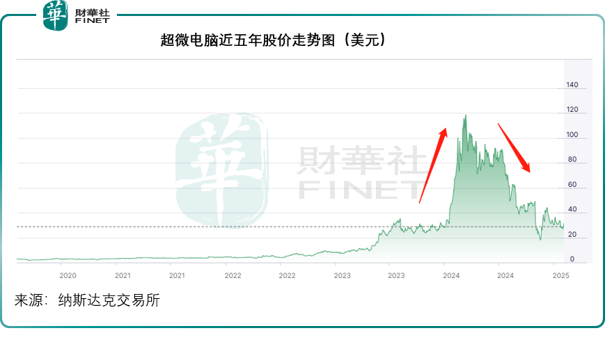 要是在两年前,英伟达的AI芯片大行其道之时,两家公司的股价远远抛离大盘指数,一同向上,站在英伟达肩膀之上的超微电脑因市值较低,涨幅更大。