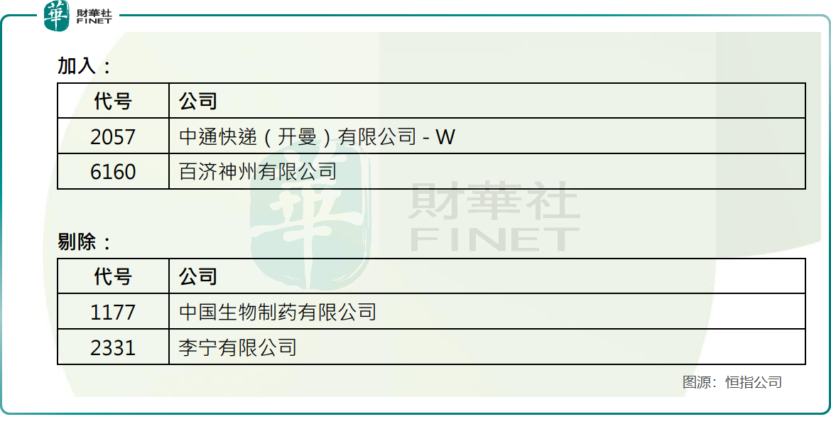 恒生中国企业指数成份股数目维持50只不变,但分别加入及剔除了两只股票。加入了中通快递(02057.HK)及百济神州(06160.HK),剔除中国生物制药(01177.HK)及李宁(02331.HK)。