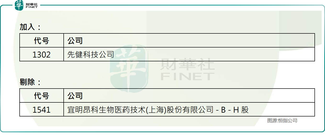 恒生生物科技指数成份股数目维持不变,为50只。变动在于加入先健科技(01302.HK),并剔除宜明昂科-B(01541.HK)。