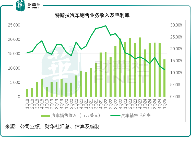 受交付量下降、车型销量占比变动和促销活动导致单车售价下降以及3亿美元的汇兑亏损影响,特斯拉的2025年第1季汽车销售收入按年下滑21.48%,至129.25亿美元;汽车销售毛利率则从上年同期的15.57%和上个季度的12.81%,下降至11.33%。