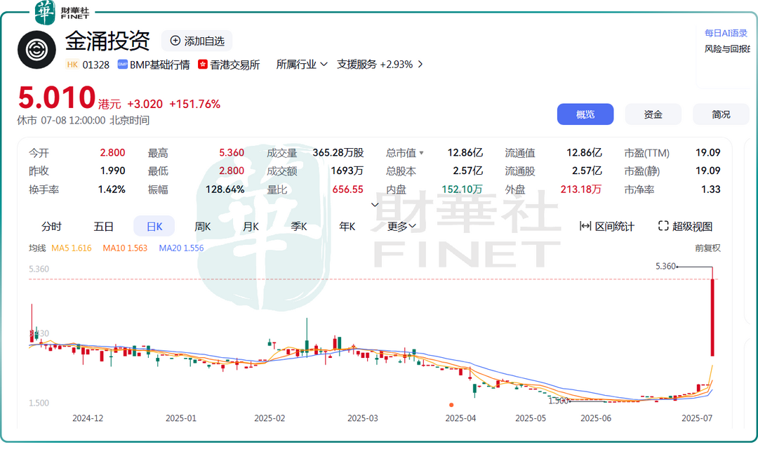 7月8日,金涌投资(01328.HK)放量大涨,盘中一度涨逾169.3%,随后该股涨幅有所收窄,截至发稿涨幅仍达151.76%,报5.01港元/股,最新总市值为12.86亿港元。