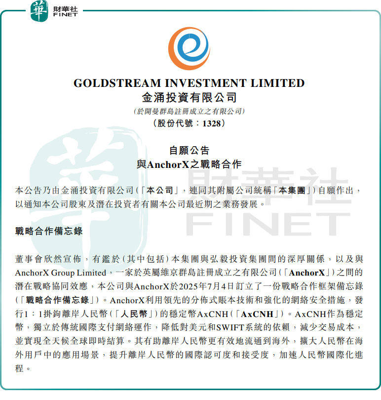 7月7日盘后,金涌投资发布公告称,公司与AnchorX于7月4日订立了一份战略合作框架备忘录。AnchorX利用领先的分布式账本技术和强化的网络安全措施,发行1:1挂钩离岸人民币的稳定币AxCNH。