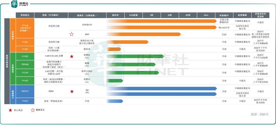 而VV116为依赖于RNA的RNA聚合酶(“RdRp”)抑制剂,其已在中国和乌兹别克斯坦获批准用于治疗COVID-19,商品名分别为民得维®及MINDVY®,且目前在中国处于治疗呼吸道合胞病毒(“RSV”)感染的II/III期临床开发。
