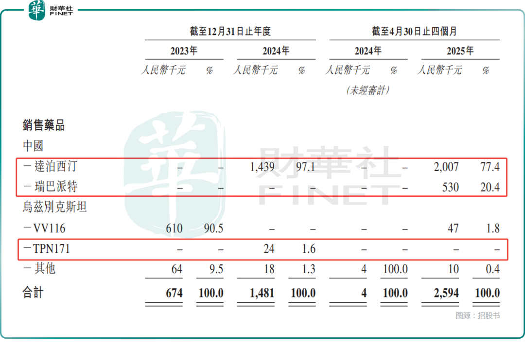 从具体的产品来看,旺山旺水生物虽然有两款商业化的创新药物,但目前药品销售收入的核心支柱其实是仿制药达泊西汀及瑞巴派特,VV116和TPN171的收入很少。