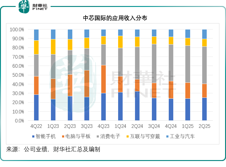 晶圆收入以应用收入来看,智能手机、电脑与平板、消费电子、互联与可穿戴,以及工业与汽车,占比分别为25.2%、15.0%、41.0%、8.2%和10.6%。